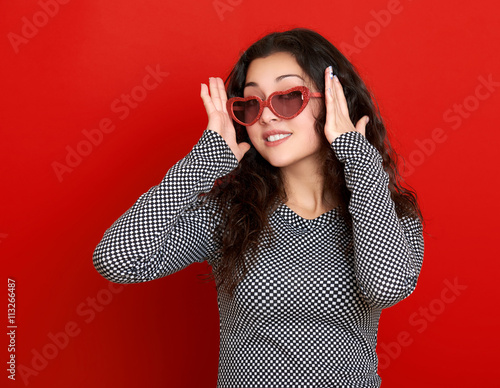 Beautiful Girl Glamour Portrait On Red In Heart Shape Sunglasses